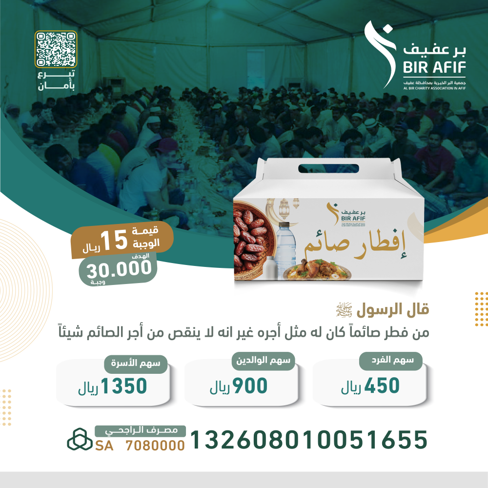 قال رسول الله صلى الله عليه وسلم ,, ((من فطر صائماً كان له مثل أجره غير أنه لا ينقص من أجر الصائم شيئا” )) كان تفطير الصائم من المشاريع الأكثر حاجة ومن أعظم قربة في شهر رمضان المبارك, حيث تقوم الجمعية بإعداد وجبات الإفطار في المساجد وخيم إفطار الصائمين بمحافظة عفيف بمعدل 10 ريال لكل وجبة.